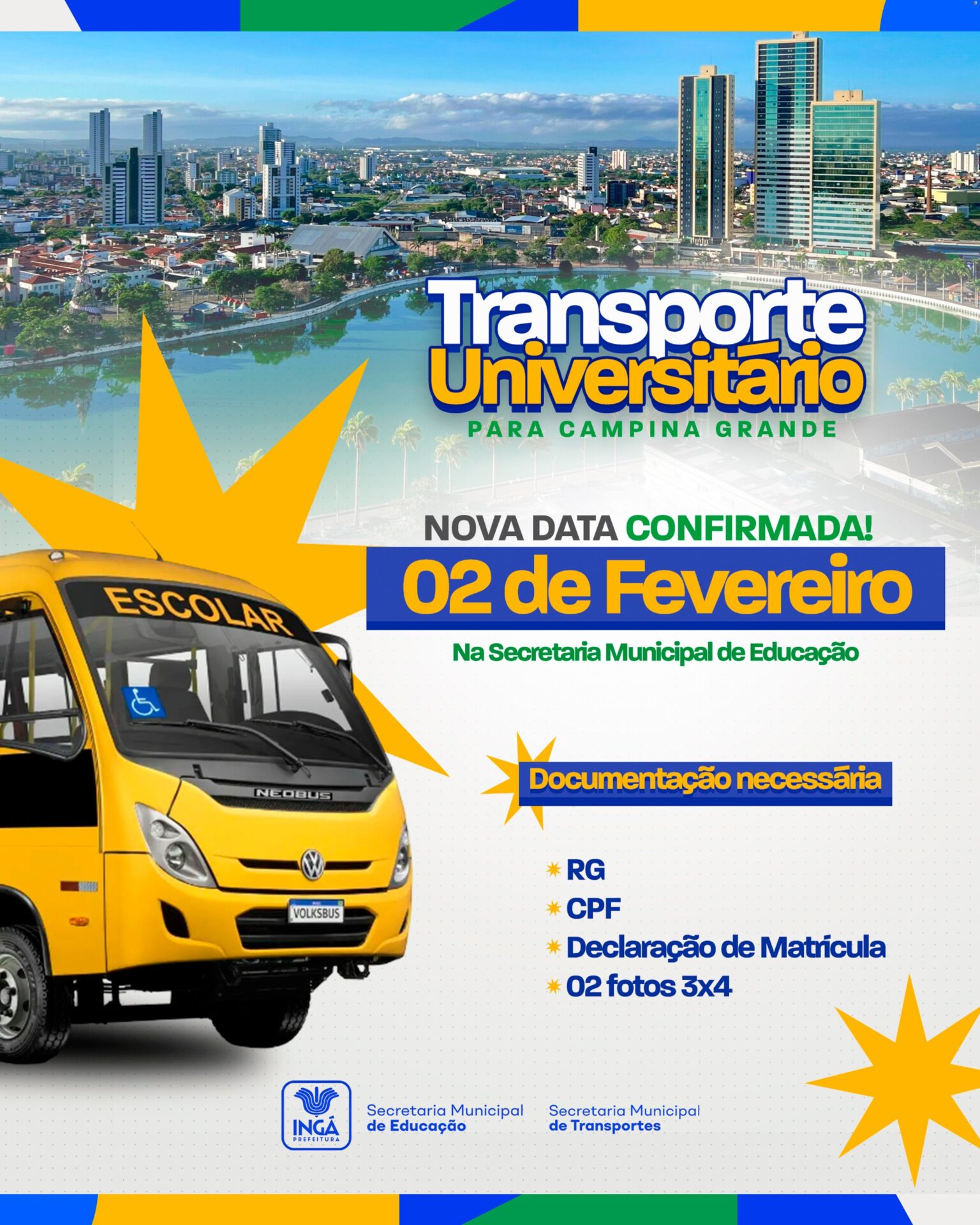 A Secretaria Municipal de Educação informa que os estudantes que utilizam o transporte universitário para Campina Grande já podem procurar a Secretaria para realizar a confecção da carteirinha.