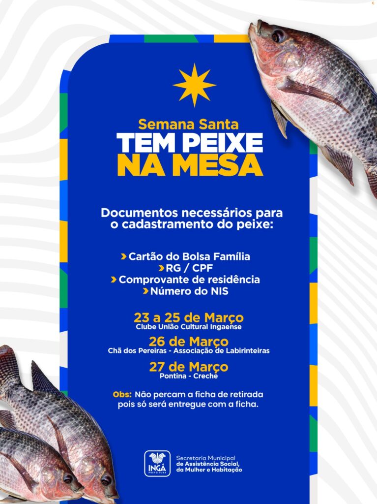 A Secretaria Municipal de Assistência Social informa que o cadastramento para a entrega do peixe será realizado na próxima semana, seguindo cronograma para zona urbana e rural.