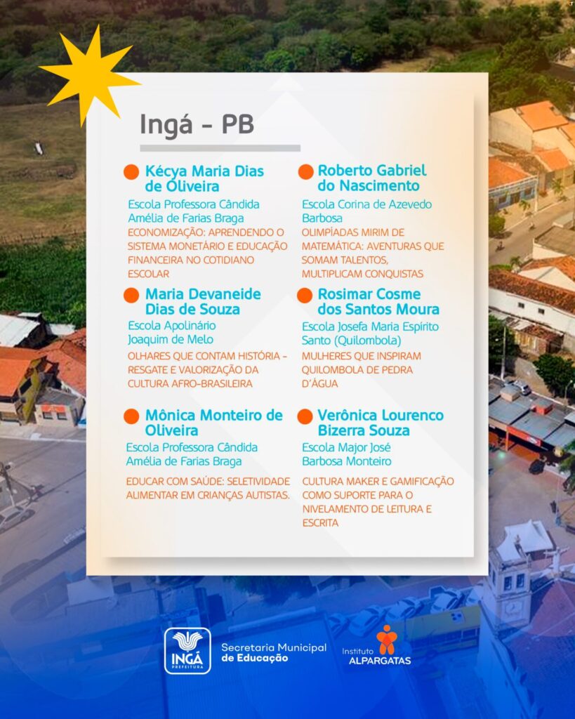 As escolas municipais de Ingá têm 13 representantes entre os 50 finalistas do Prêmio Educador Nota 10, que se destacaram na iniciativa do Instituto Alpargatas – Edição 2025, com práticas que promovem sustentabilidade, inclusão, diversidade e aprendizagem significativa.
