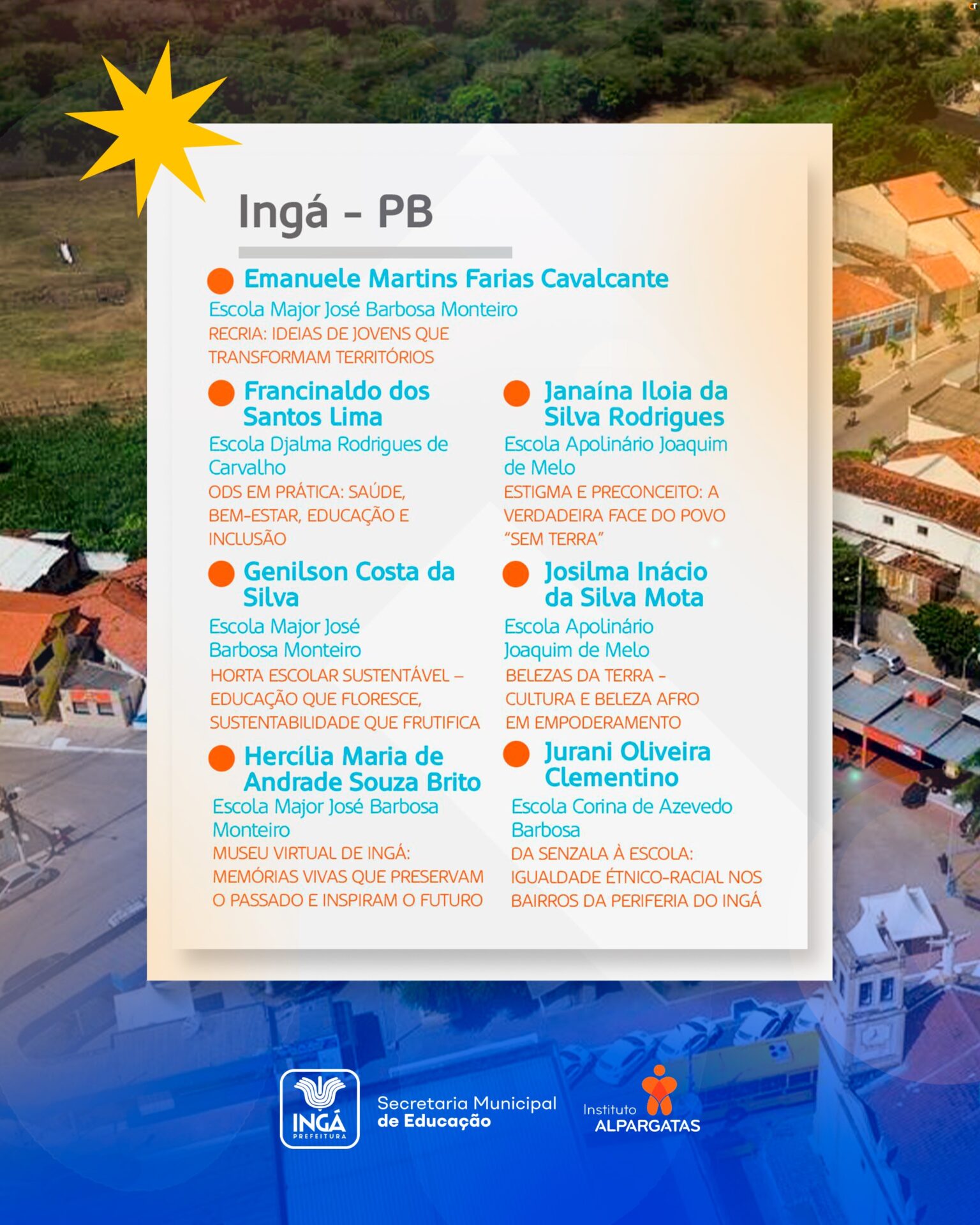 As escolas municipais de Ingá têm 13 representantes entre os 50 finalistas do Prêmio Educador Nota 10, que se destacaram na iniciativa do Instituto Alpargatas – Edição 2025, com práticas que promovem sustentabilidade, inclusão, diversidade e aprendizagem significativa.